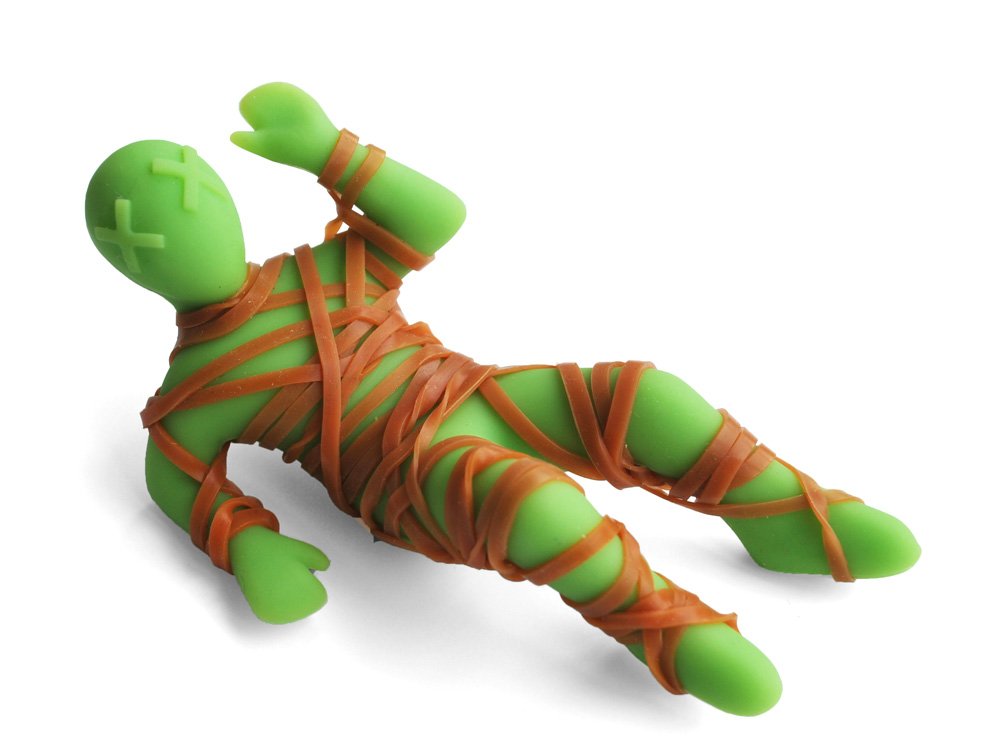 Mummy Mike will be happy to hold their rubber bands until they need them. Use him to create works of art by arranging the rubber bands in a creative fashion. Your artist coworker will be delighted with a gift that can help them relax as they wind rubber bands around Mike. You can also keep an eye on their mood by monitoring Mike. Does it appear that he has been strangled? If all the rubber bands are around his throat, you might want to suggest a visit to the therapist to assist with working out the anger.
